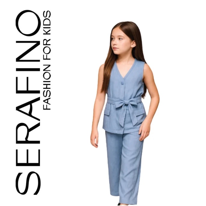 Εφηβικό σετ 2τμχ για κορίτσι αποτελούμενο από γιλέκο με κούμπωμα κουμπάκια, ζώνη δετή στη μέση και σχέδιο με τσέπες. Επίσης παντελόνα σε ανοιχτή γραμμή με λάστιχο φαρδύ με πιέτες στη μέση, σχέδιο με ραμμένη ρίγα κατά μήκος και τσέπες. Μια εξαιρετική πρόταση από την Serafino.