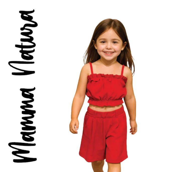 Παιδικό σετ 2τμχ για κορίτσι αποτελούμενο από μπουστάκι crop top, σχέδιο με υφασμάτινα λουλουδάκια στο στήθος, εξαιρετικά απαλό ύφασμα, εσωτερικό λάστιχο στο άνω και το κάτω μέρος και ρυθμιζόμενα τιραντάκια. Επίσης, σορτσάκι με τσέπες και λάστιχο στη μέση. Μια ιδιαίτερη πρόταση για από την Mama Natura.